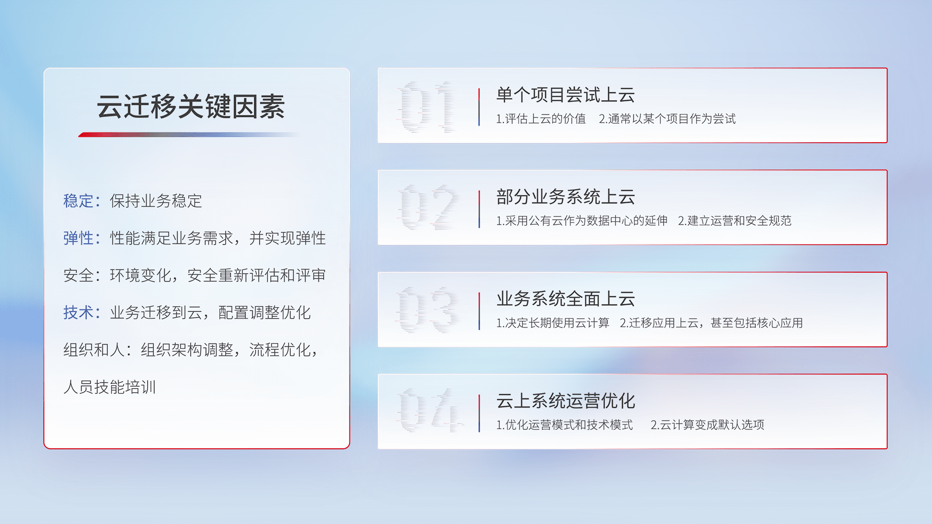 结合实际业务,,,,从规划设计、、、云平台选型、、云原生改造、、、数据迁移、、集成交付,,迁移全过程为客户识别最佳上云路径,,,,做好风险识别管理,,,,设计网络架构、、身份权限、、安全审计合规、、操作审计、、日志审计、、、监控告警策略、、、多站点容灾设计等,,,,对云上基础设施进行整体规划,,,,提升IT治理水平,,以满足弹性、、高可用、、高性能的需求。。